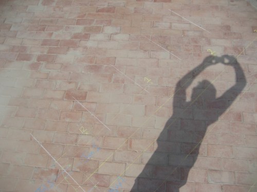 When the spreadsheet spits out your numbers, just check the pictured sundial on the sheet called “Layout” and make sure it’s identical to the mini-sundial made by the applet. If it is, you’re ready to start building the real sundial. Start by creating an origin point (like 0,0 on a graph) somewhere in the middle of your true North/South line. Then it’s just like making a giant graph- use the x and y coordinates to plot the hour markers, and the x and “date point Z” coordinates to plot the dates. I did mine in chalk first on the pavement to check if it actually works.