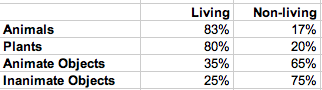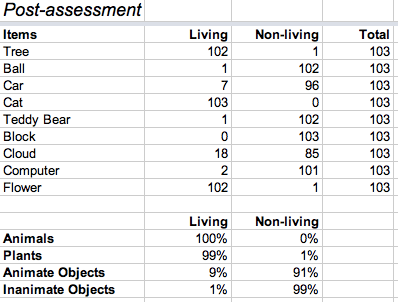 What’s most interesting to me is to notice which nonliving objects are misidentified the most: car, computer, cloud, and teddy bear are all misidentified by about 1/3 of the students! It’s pretty easy to understand why- 3 of them move and change, and 1 resembles a living thing.
