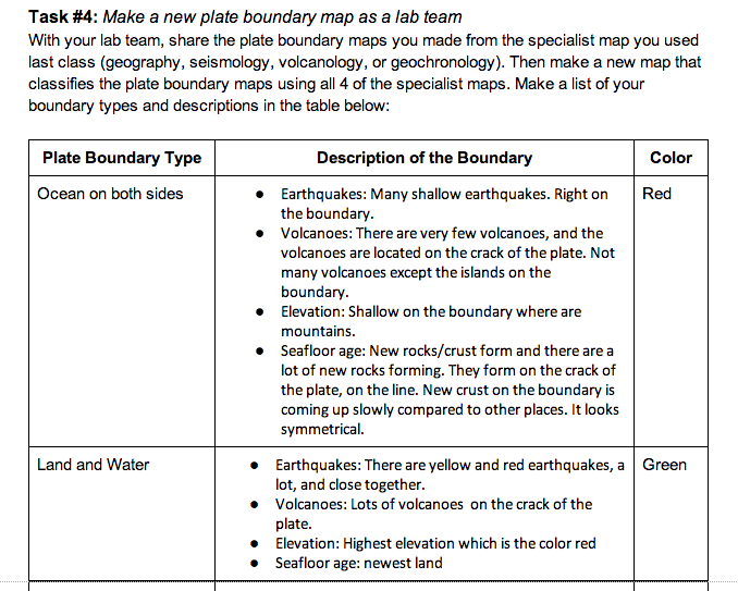 I adapted this first learning activity from a fantastic inquiry-based lesson called Discovering Plate Boundaries developed at Rice University. The multi-part lesson engages students with real maps of relevant plate tectonic information (volcanology, seismology, geography, and geochronology) and challenges them to discover patterns at the boundaries of plates and then classify them. Each student on the team becomes an expert on one of the 4 maps, and then they use their combined understanding to classify all of the major plate boundaries in the world on a collaborative document (I still have them label the map on paper though- it’s just much more efficient for coloring!)